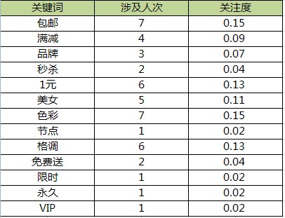 四、從選圖理由中提煉出來的關鍵詞可以得知:包郵信息,圖片色彩分別有七人次提及,為最受關注屬性。其次為一元信息,圖片格調分別有6人次提 及,算重要屬性。像秒殺、限時、VIP,免費送四個關鍵詞的提及率就非常低。由此可見:限時秒殺,免費送這樣的信息已經在淘寶泛濫,消費者對此甚至觸發反 面情感